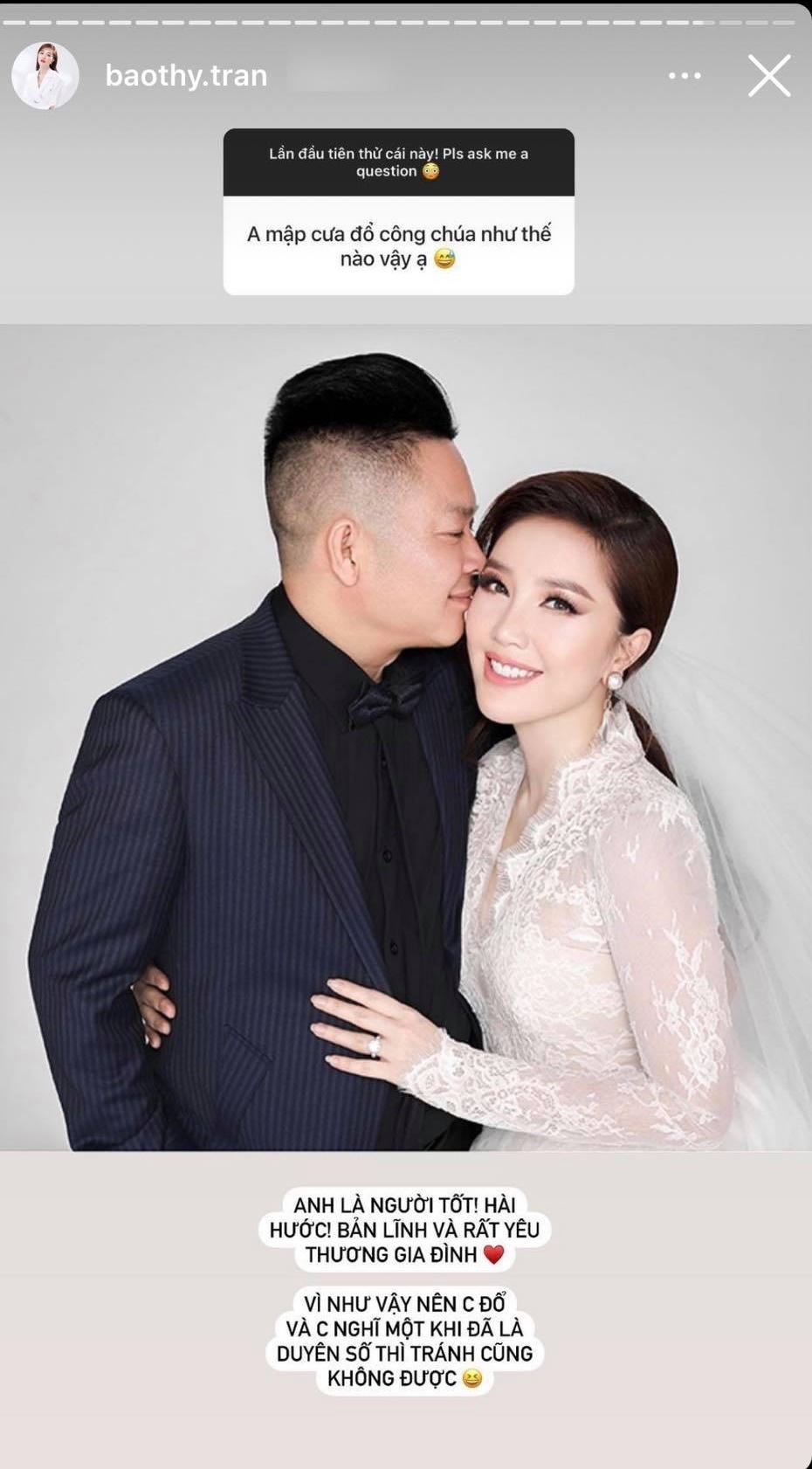 Tiếp theo đó nhiều khán giả cũng thắc mắc "anh Mập" đã làm như thế nào để cưa đổ được Bảo Thy? giọng ca Ngày buồn nhất bật mí thêm: "Anh là người tốt, hài hước bản lĩnh và rất yêu thương gia đình. Vì vậy nên chị đổ, chị nghĩ một khi đã là duyên số thì tránh cũng không được".