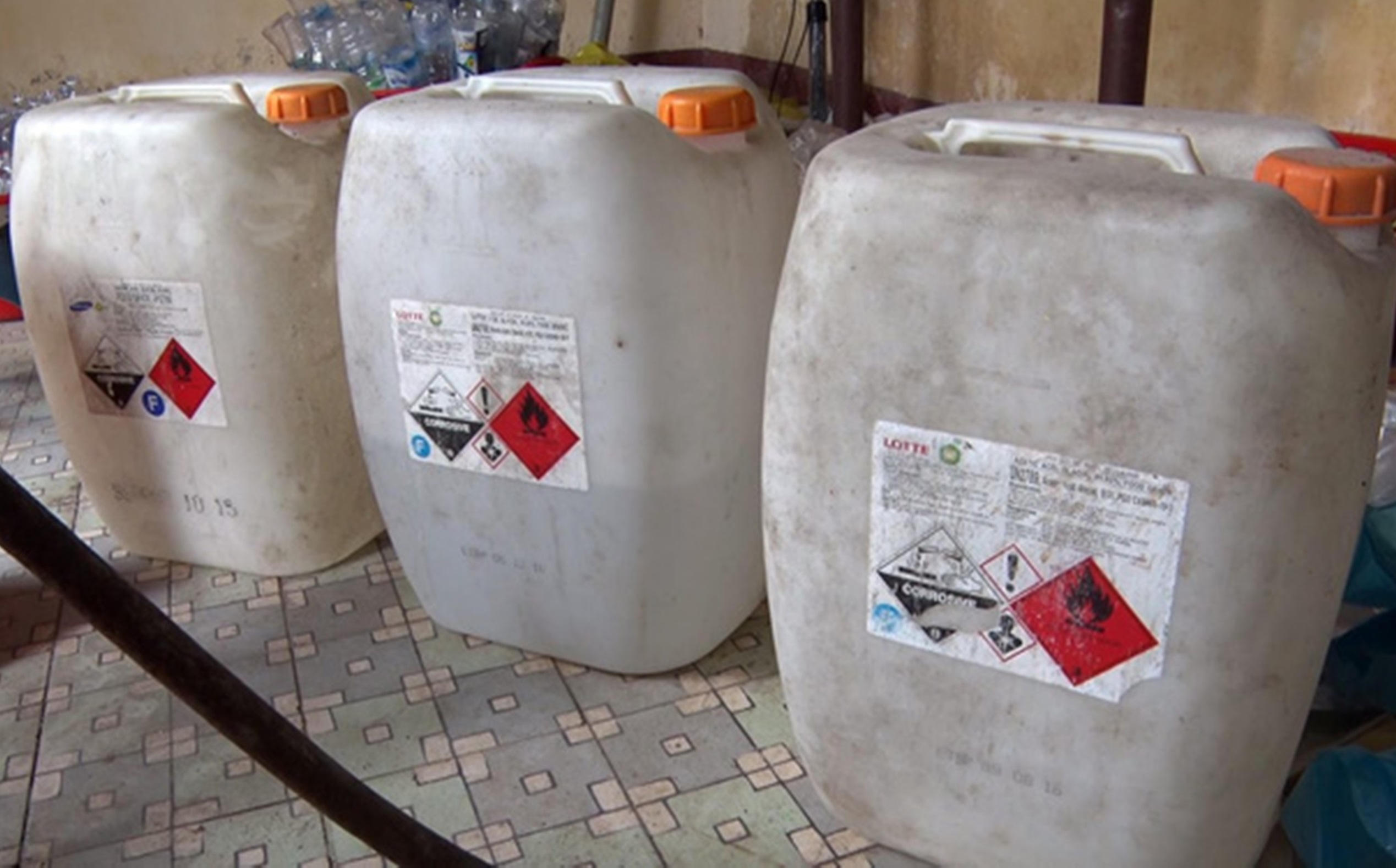 Lực lượng chức năng phát hiện hàng trăm lọ chai đã qua sử dụng cùng nhiều thùng axit axetic công nghiệp không rõ nguồn gốc và hết hạn sử dụng. Mùi nồng nặc của axit axetic bốc hơi khắp căn nhà.