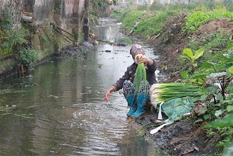 (PLO) - Dưới dòng nước đen ngòm, bốc mùi hôi thối cùng với nước phân, nước thải sinh hoạt đang chảy ra từ những miệng cống, một số người dân ở xã Yên Hòa, Yên Mỹ, Hưng Yên bịt khẩu trang, vô tư rửa rau mang đi bán.