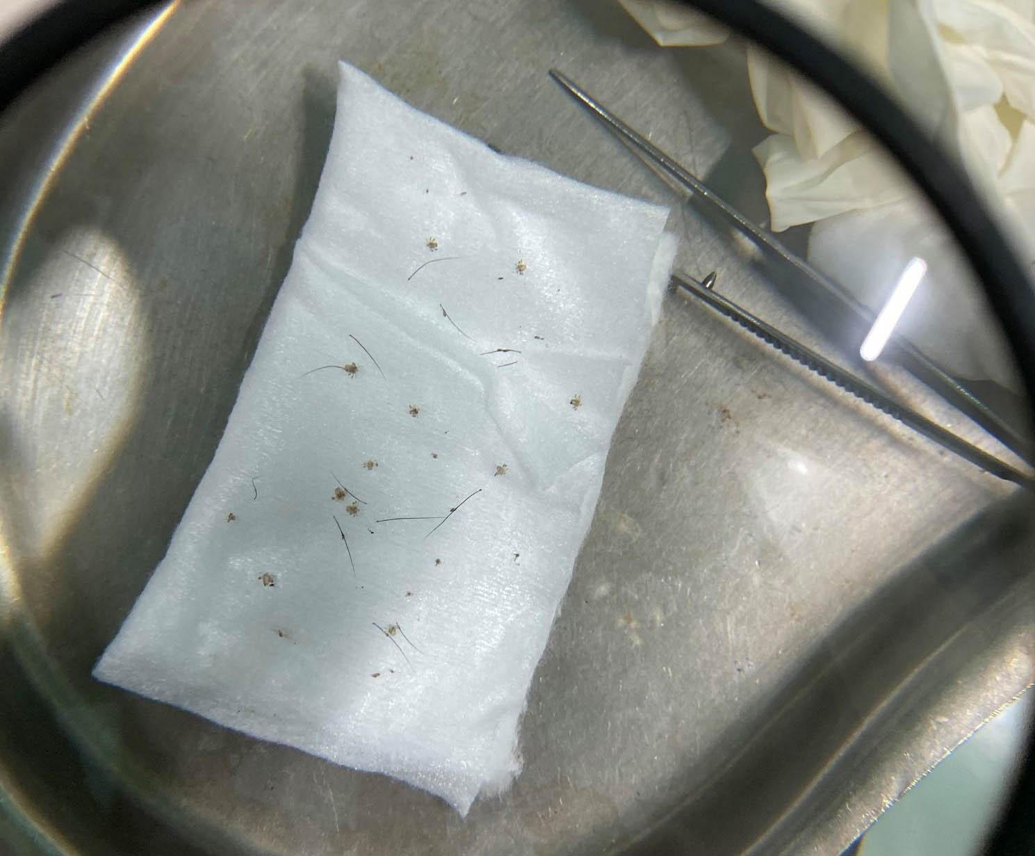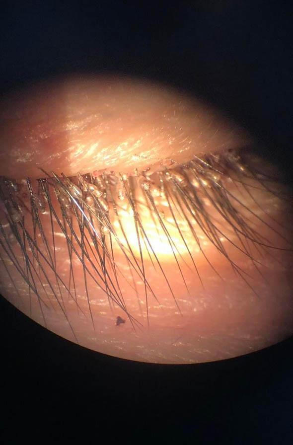 Ngay sau đó, các bác sĩ tiến hành gây tê tại chỗ và lấy ra gần 100 con rận mu và hơn 100 trứng ký sinh trên mi mắt người bệnh.
