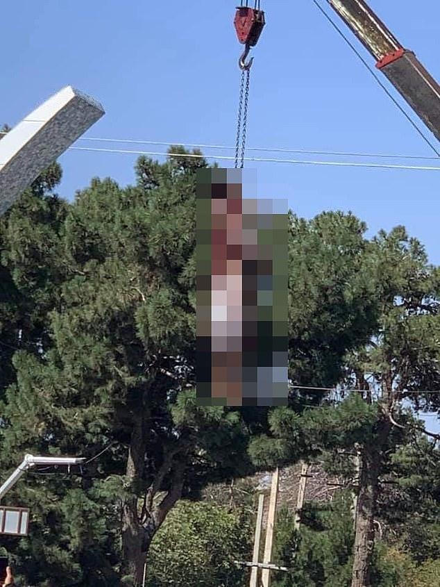 Những bức ảnh kinh hoàng cho thấy thi thể của một kẻ bắt cóc bị treo trên cần cẩu phía trên quảng trường chính ở thành phố Herat của Afghanistan. |