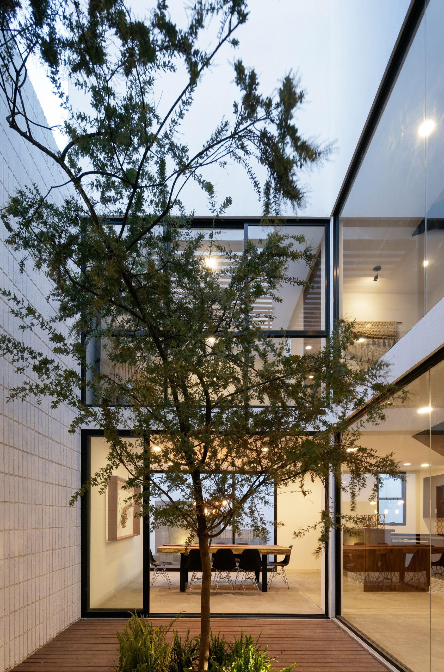 Công ty thiết kế Espacio 18 chừa ra một khoảng đất nhỏ của căn nhà để làm sân vườn bên trong, với mục đích tạo cho gia chủ một chút không gian ngoài trời vì Casa Once được xây dựng trên toàn bộ diện tích sẵn có. Vì vậy, phần hướng ra vườn cây ở cả hai tầng của căn nhà đều là kính trong suốt. Tuy nhiên, thay vì đổ đất vào khoảng sân, nhóm thiết kế lại ốp gỗ hoàn toàn và chỉ chừa lại một khoảng nhỏ ở giữa để trồng cây keo với những bông hoa màu tím tươi nở rộ vào mùa xuân.