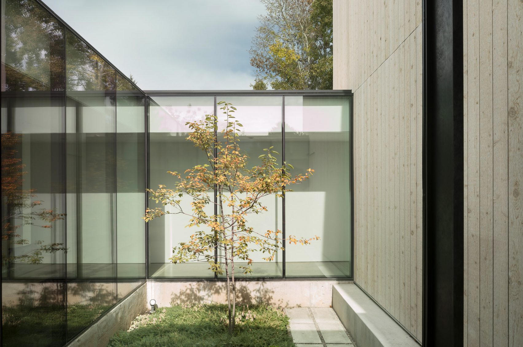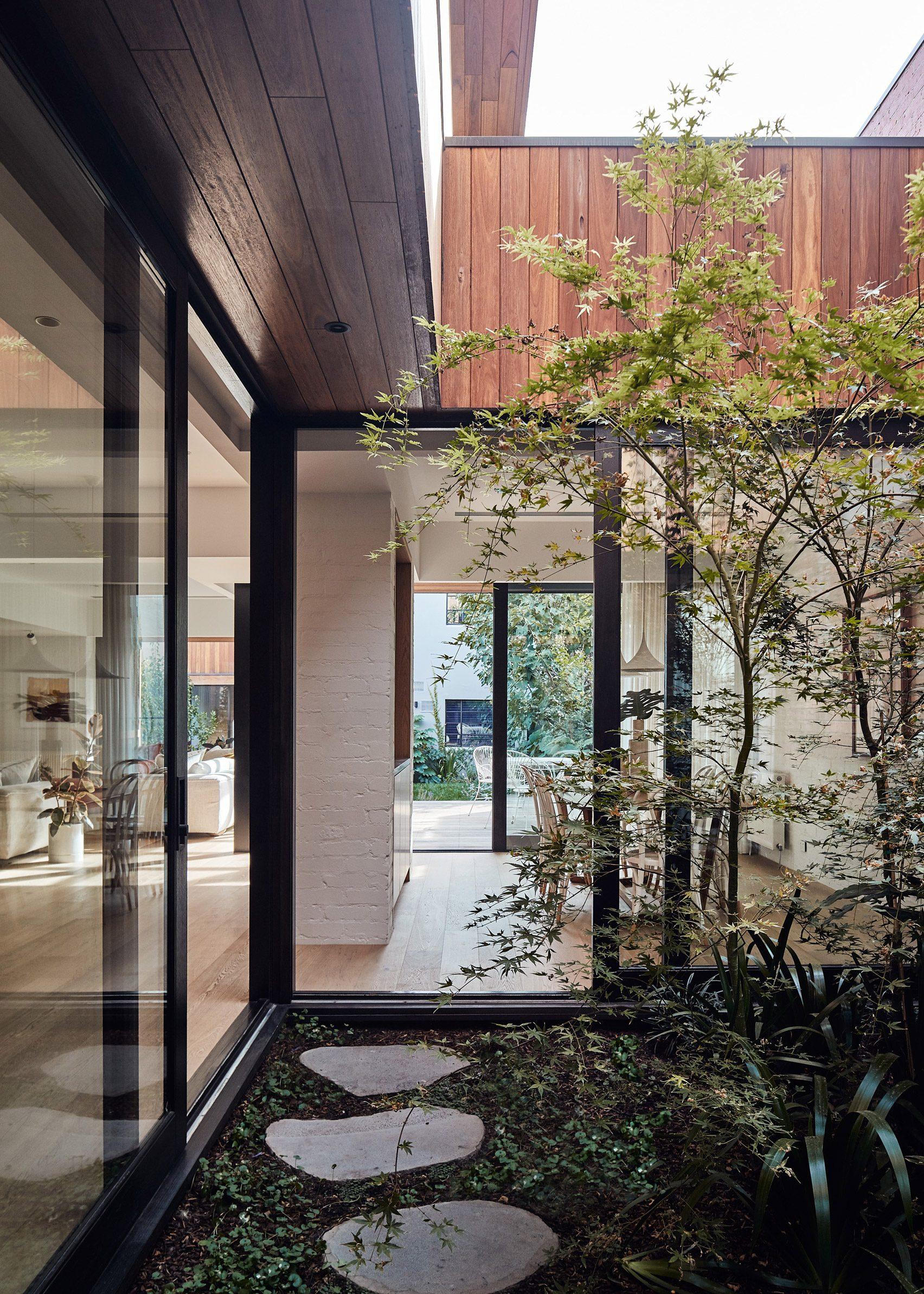 Sân vườn nhỏ bên trong Carlton House trồng một vài cây phong Nhật Bản và đất được trồng cỏ phủ kín. Gia chủ đặt thêm một số viên đá để tạo lối đi qua các khu vực khác nhau của căn nhà gạch mang phong cách Edwardian này. Cũng với chức năng là giếng trời và tạo cảm giác tươi sáng cho không gian, vườn mini được bao quanh bởi các cửa kính trong suốt dạng trượt.