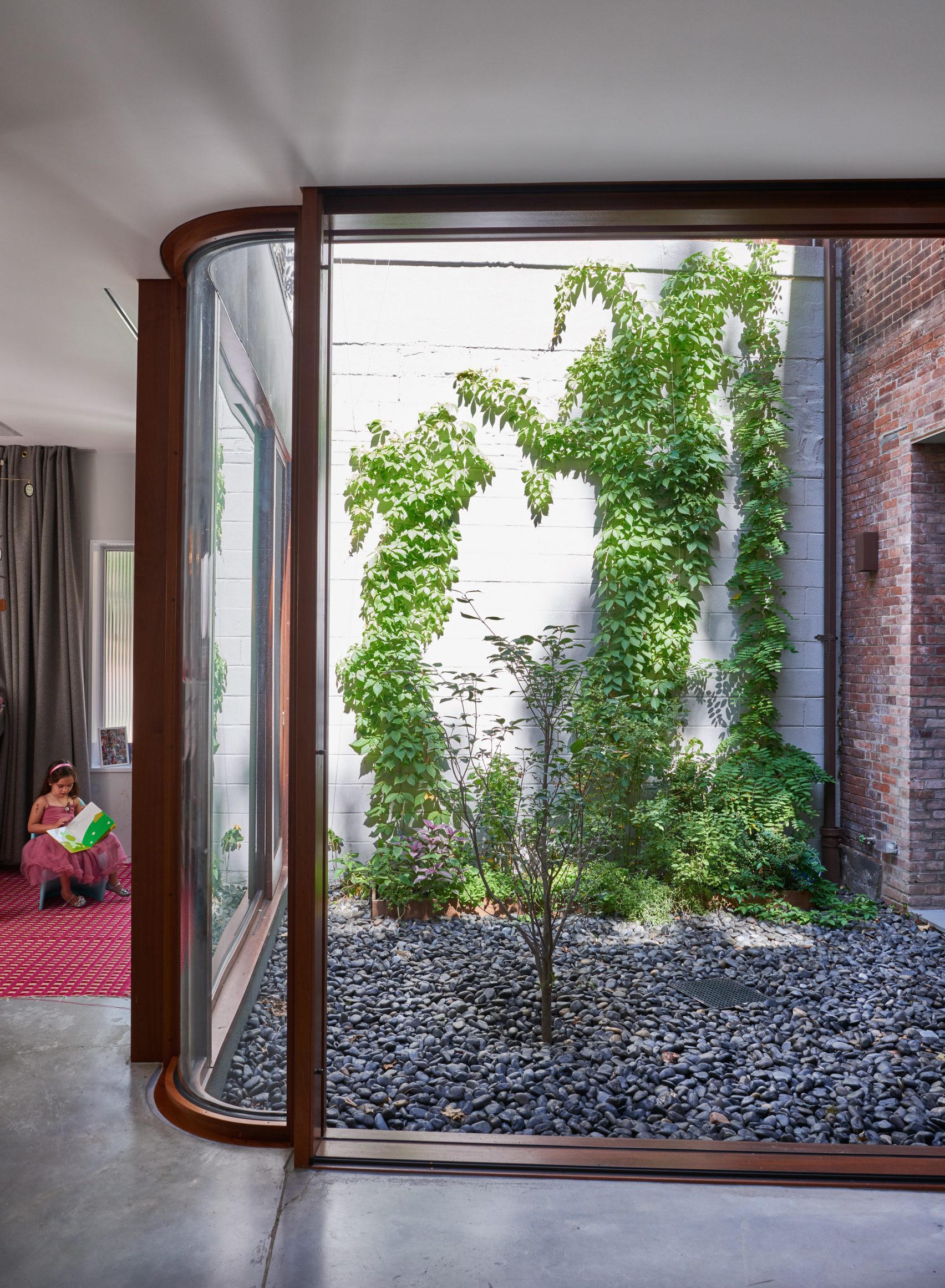 Ngôi nhà phố bằng gạch có từ thế kỷ 19 ở Brooklyn này được O'Neill McVoy Architects thiết kế lại với việc mang một khoảng sân nhỏ vào trong nhà. Nhóm thiết kế đã tạo ra một khu vườn ánh sáng rộng 18 m2 ở trung tâm của căn nhà, với cửa kính trượt và khung gỗ gụ bao quanh. Sân vườn này đơn thuần được sử dụng như một nơi để lấy ánh sáng cũng như trang trí cho căn nhà, nên gia chủ trồng một số cây dây leo, ngoài cây sơn thù du, và rải đá sông màu đen để che nền đất.