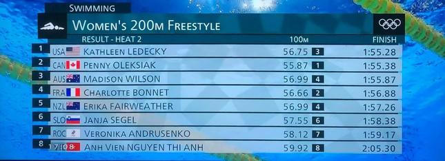 Mặc dù đã rất nỗ lực, nhưng trước sân chơi lớn cùng những kình ngư hàng đầu thế giới, Ánh Viên đã không thể tạo ra sự bất ngờ khi về cuối lượt thứ 2 với thành tích 2 phút 5 giây 30. Người về nhất ở lượt thi này là nữ VĐV Ledecky với thành tích 1 phút 55 giây 28 – VĐV này từng giành 5 HCV cá nhân Olympic và là đương kim vô địch nội dung này.