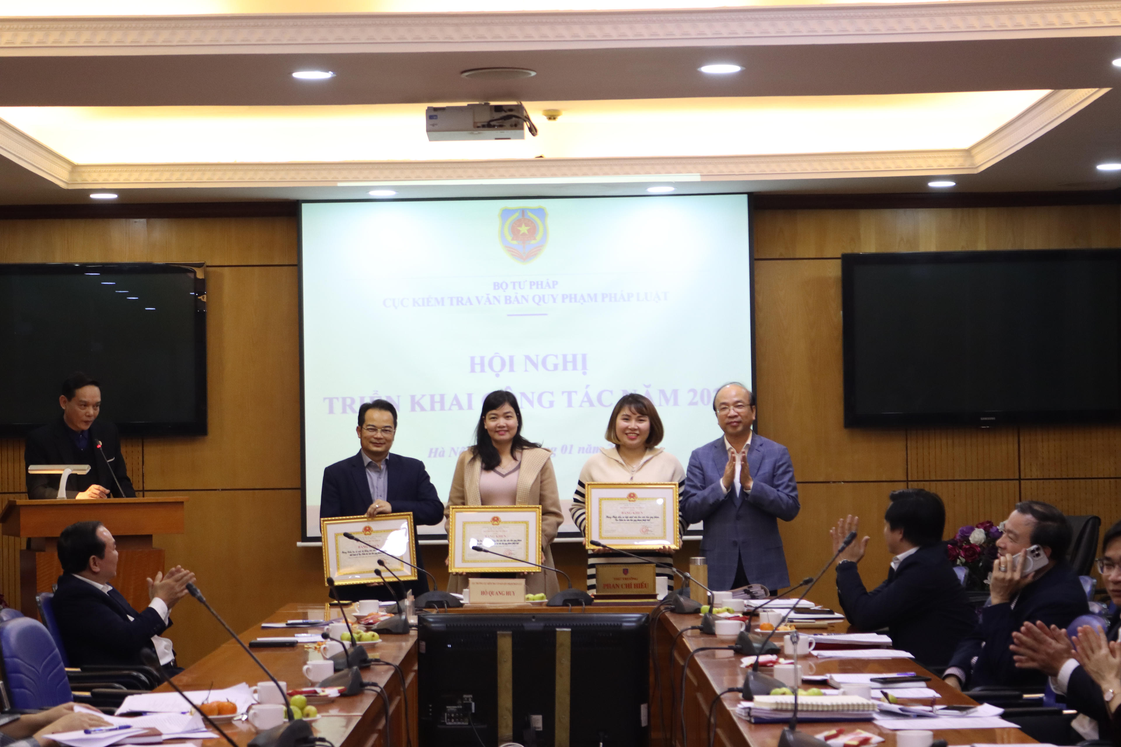 Thứ trưởng Phan Chí Hiếu trao Bằng khen của Bộ trưởng Bộ Tư pháp cho các cán bộ có thành tích tốt trong công tác Kiểm tra văn bản QPPL. |