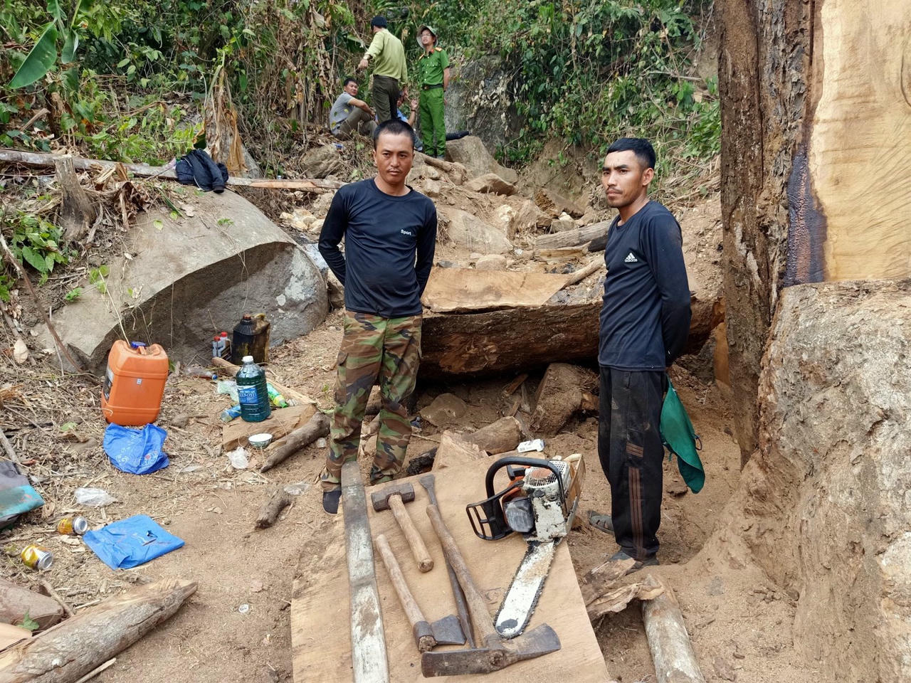 | Bắt quả tang Uyên và Ninh cùng tang vật đang thực hiện hành vi phá rừng |
