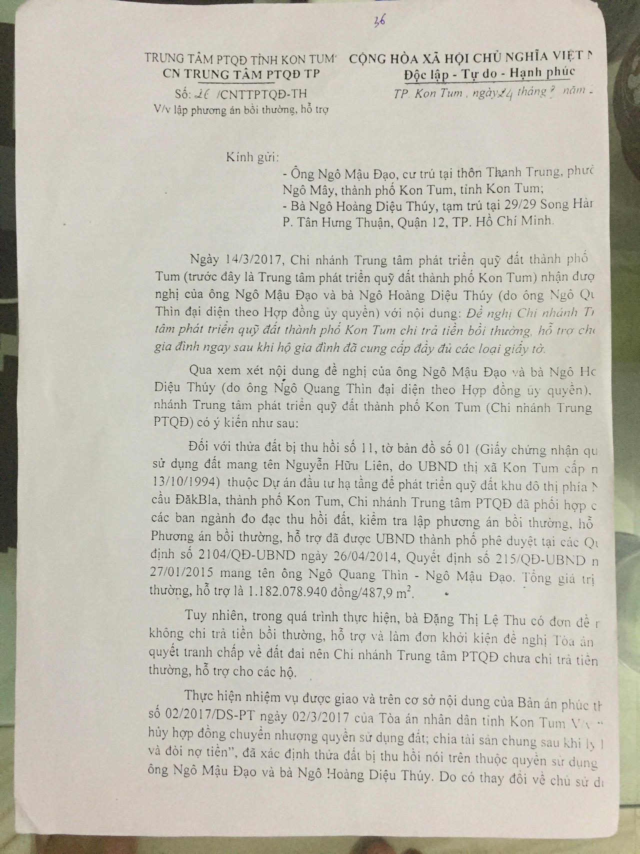 Thế nhưng không hiểu vì nguyên nhân gì, CNTTPTQĐ TP. Kon Tum vẫn không chịu lập phương án chi trả tiền bồi thường, hỗ trợ lô đất bị thu hồi cho ông Đạo, bà Thúy.