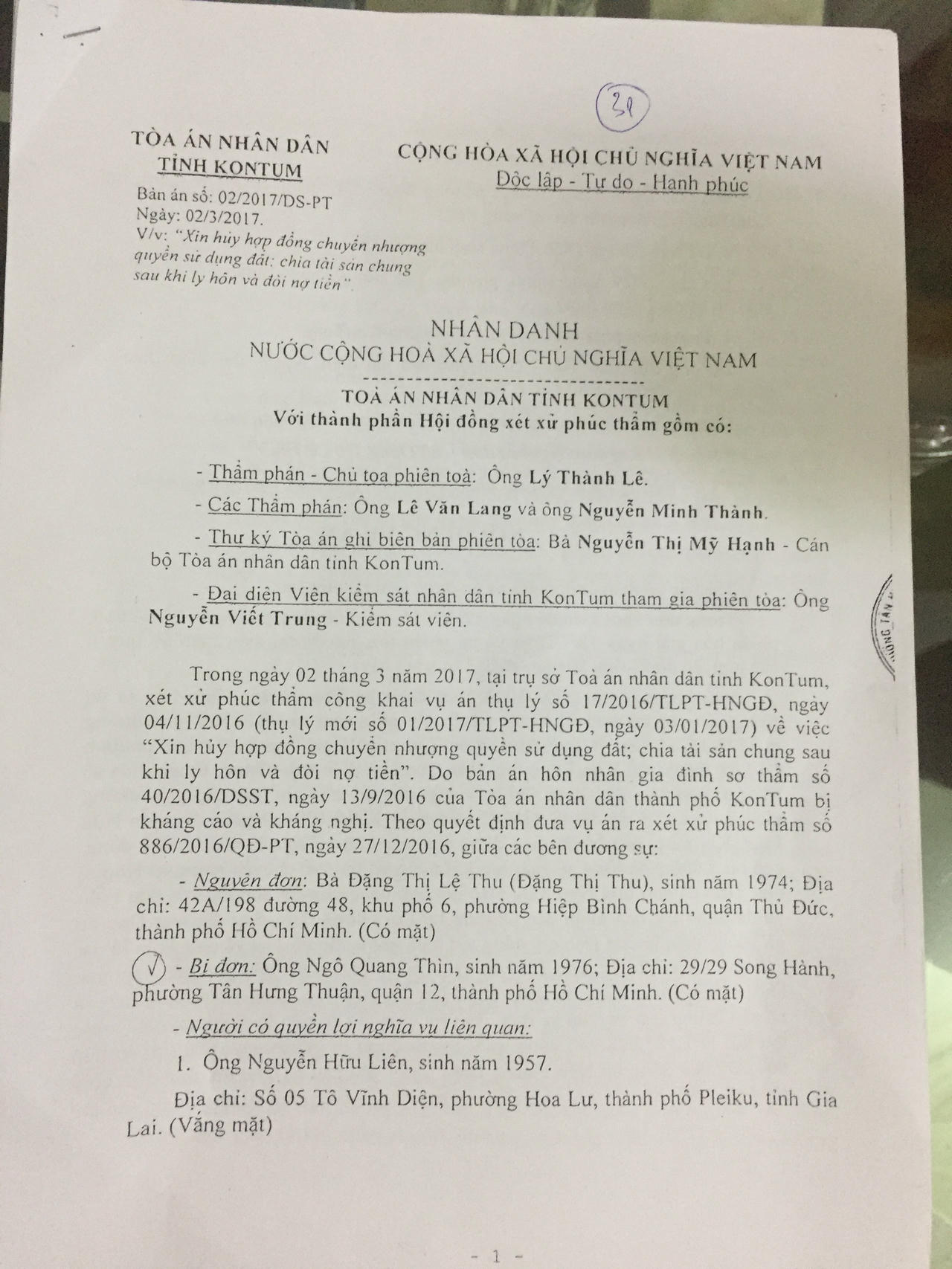 Ngày 13/9/2016, TADN TP. Kon Tum đã mở phiên tòa sơ thẩm theo đơn khởi kiện của bà Thu. Sau khi xem xét mọi chứng cứ, tòa án tuyên bác đơn khởi kiện về việc “Xin hủy hợp đồng chuyển nhượng quyền sử dụng đất và chia tài sản sau ly hôn” của bà Thu.