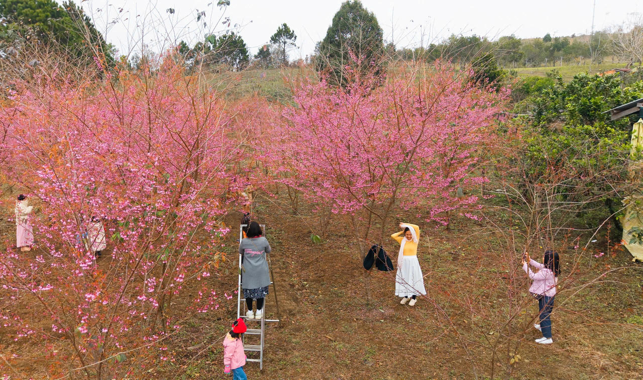 Du khách thích thú tham quan check in, chụp hình cùng hoa Anh Đào nở rộ. |