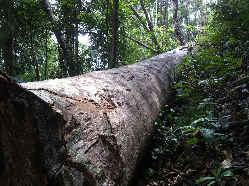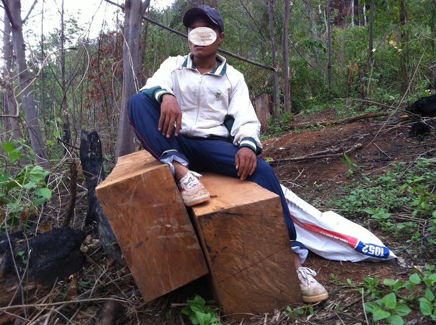 Càng đi đến gần khu rừng, tiếng máy cưa, tiếng cây đổ càng rõ hơn. Sau gần 30 phút leo đồi, chúng tôi bắt gặp 4 hộp gỗ lớn còn rất mới và có mùi thơm của gỗ đang nằm ngay bìa rừng, đo đạc sơ bộ các hộp gỗ dài khoảng 2,5m, đường kính 40x60. Quan sát quanh khu vực này, chúng tôi phát hiện nhiều vết kéo, trượt dài, chắc do “lâm tặc” vừa mới kéo ra không lâu.