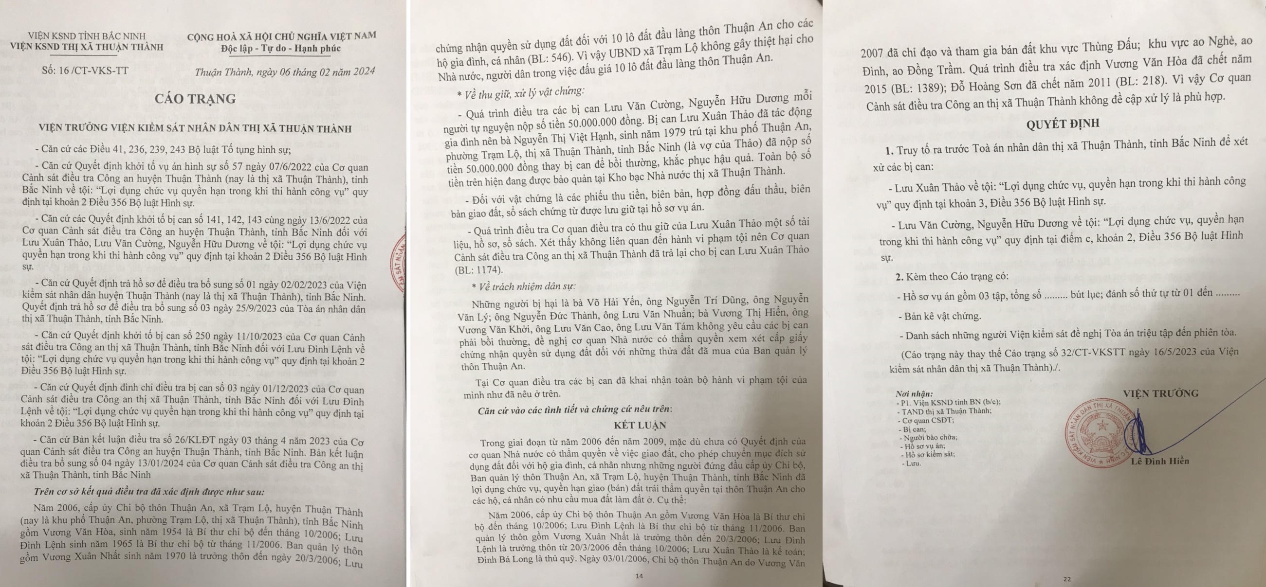 Ngày 6/2/2024 Viện kiểm sát nhân dân thị xã Thuận Thành ra cáo trạng số 16/CT-VKS-TT thay thế cho cáo trạng số 32/CT-VKS-TT đã ban hành trước đó. Cáo trạng mới xác định, trong giai đoạn 2006 – 2009, mặc dù chưa có quyết định của cơ quan Nhà nước có thẩm quyền về việc giao đất, cho phép chuyển mục đích sử dụng đất với hộ gia đình, cá nhân nhưng những người đứng đầu cấp ủy Chi bộ, Ban quản lý thôn Thuận An xã Trạm Lộ (nay là khu phố Thuận An, phường Trạm Lộ, thị xã Thuận Thành, Bắc Ninh) đã lợi dụng chức vụ, quyền hạn giao bán đất trái thẩm quyền tại thôn Thuận An cho các hộ, cá nhân có nhu cầu mua đất ở. Cáo trạng xác định, ông Lưu Đình Lệnh (đã chết) là người trực tiếp chỉ đạo việc tổ chức bán đất tại thôn Thuận An.