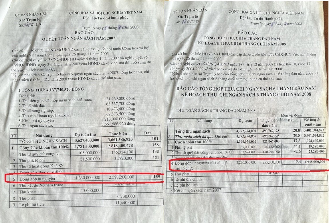 Trong các báo cáo quyết toán ngân sách năm 2007, năm 2008 của UBND xã Trạm Lộ cũng cho thấy những nguồn thu lớn do cá nhân, tổ chức đóng góp. Cụ thể, báo cáo quyết toán ngân sách năm 2007 ngày 05/7/2008 có mục Đóng góp tự nguyện, với dự toán thu là 1.630.000.000 đồng và thực hiện là 2.597.200.000 đồng, đạt 159%; Báo cáo tổng hợp thu, chi 6 tháng đầu năm, kế hoạch thu, chi 6 tháng cuối năm 2008 ngày 05/7/2008 có mục Đóng góp tự nguyện của cá nhân, các tổ chức, với dự toán thu là 2.220.000.000 đồng, thực hiện đầu năm 275.000.000 đồng và kế hoạch cuối năm 1.945.000.000 đồng.