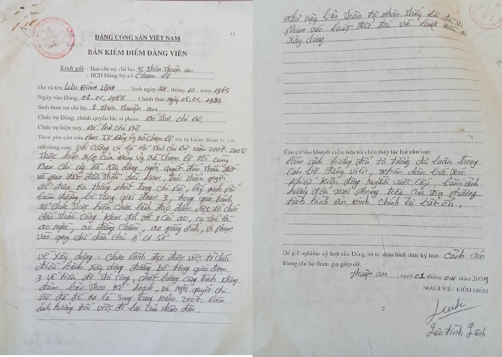 Trong bản kiểm điểm đảng viên của ông Lưu Đình Lệnh ngày 01/4/2009 về việc giao đất trái thẩm quyền cũng có nội dung xác nhận: “Với cương vị là Bí thư Chi bộ năm 2007-2008. Thực hiện nghị quyết của Đảng ủy xã Trạm Lộ, tôi cùng ban chi ủy đã xây dựng nghị quyết đấu thầu đất và giao đất đấu thầu dài hạn trái thẩm quyền để đưa ra thống nhất trong chi bộ, lấy kinh phí làm đường bê tông giai đoạn 3”;
