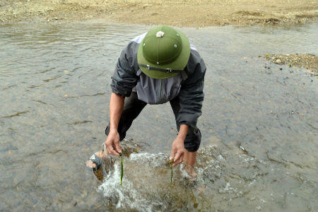 Chị Mến đưa cho chúng tôi 2 cái rổ lớn rồi bảo: “Nếu các anh thực sự muốn thử làm món này thì phải biết cách lấy rêu đã rồi mới nói đến cách làm được”. Theo chân chị Mến, chúng tôi đi về phía thượng nguồn của con suối chạy qua làng Trung nhặt rêu. Chị Mến thở dài bảo, những năm gần đây đời sống phát triển khiến môi trường bị ô nhiễm nên rêu mọc càng ít hơn ngày trước.