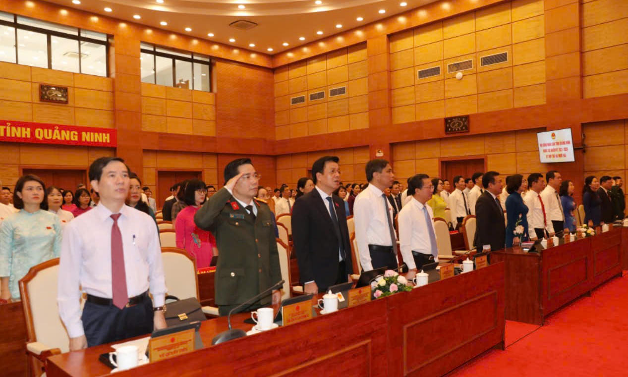Đại biểu HĐND tỉnh Quảng Ninh thực hiện nghi lễ chào cờ khai mạc kỳ họp. |