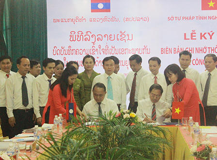 Chứng kiến lễ ký kết có ông Lê Xuân Đại - Phó Chủ tịch Thường trực UBND tỉnh cùng đại diện các Sở, ban ngành liên quan cùng lãnh đạo các huyện có đường biên giới Việt - Lào. Về phía CHDCND Lào có ông Somphone Inkhavilay - Giám đốc Sở Tư pháp Hủa Phăn.