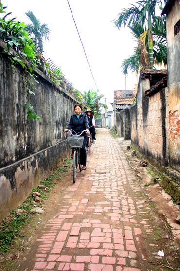 Đến một ngày, người làng sáng kiến làm đường gạch do những cô gái chuẩn bị lấy chồng đóng góp. "Cô lấy chồng xa phải đóng 2 mâm đồng để làng làm cỗ, cô lấy chồng gần thì nộp gạch. Chị gái tôi phải nộp 400 viên gạch. Sau đó đường đi lối lại đã lát hết nên con gái lấy chồng làng chỉ còn phải nộp 200 viên thôi", cụ Loan nhớ lại.