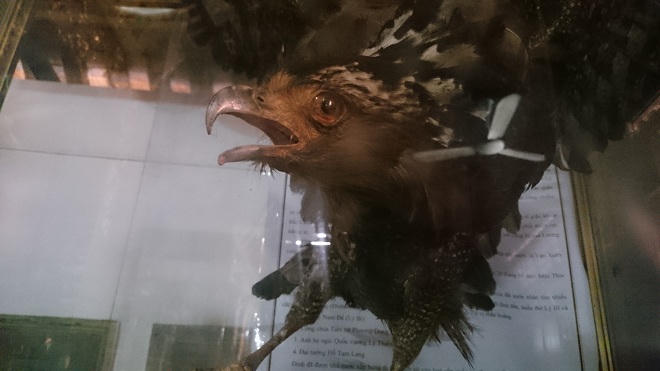Người dân cho rằng, đó là chim thiêng nên đã phát nguyện góp tiền của thuê thợ ướp xác, thuộc da và cho vào tủ kính để mọi người cùng tưởng nhớ.