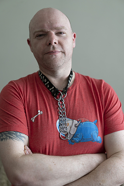 Kaz James (người Anh) thích ăn trong chiếc bát dành cho chó, đeo mặt nạ chó, sủa, liếm và ngoạm bạn bè.
