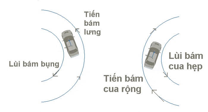 Nguyên tắc: Tiến bám lưng, lùi bám bụng. Đây là khẩu quyết mà trường đào tạo thường chỉ dạy cho học viên khi bắt đầu học lái, phải tiến và lùi ở đường chữ S hoặc đường zích zắc. Tức khi tiến phải bám vào bên cua rộng hơn, ví dụ cua trái thì bám phải, cua phải bám trái. Ngược lại, lùi phải bám phải và lùi trái bám trái.