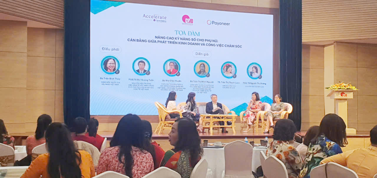 Trong khuôn khổ chương trình, các đại biểu đã cùng tham gia Tọa đàm “Nâng cao kỹ năng số cho phụ nữ: Cân bằng giữa phát triển kinh doanh và công việc chăm sóc”. Tọa đàm được tổ chức dưới sự điều phối của bà Trần Bích Thủy - Giám đốc quốc gia HelpAge Việt Nam, cùng sự tham gia của các diễn giả: PGS.TS Bùi Quang Tuấn - Nguyên Viện trưởng Viện Kinh tế Việt Nam (VASS), Phó chủ tịch Hội Khoa học Kinh tế Việt Nam; Bà Mai Diệu Huyền – Phó Chủ tịch phụ trách Hội đồng Doanh nhân nữ Việt Nam, Liên đoàn Thương mại và Công nghiệp Việt Nam; Bà Trần Thị Minh Nguyệt – Giám đốc Dự án, Chuyên gia Tài chính bao trùm và Hỗ trợ nữ chủ doanh nghiệp - Tổ chức CARE quốc tế tại Việt Nam; TS. Trần Thị Thanh Loan – Viện Nghiên cứu Gia đình và giới; PGS.TS Nguyễn Thu Hương – Chuyên gia nghiên cứu.
