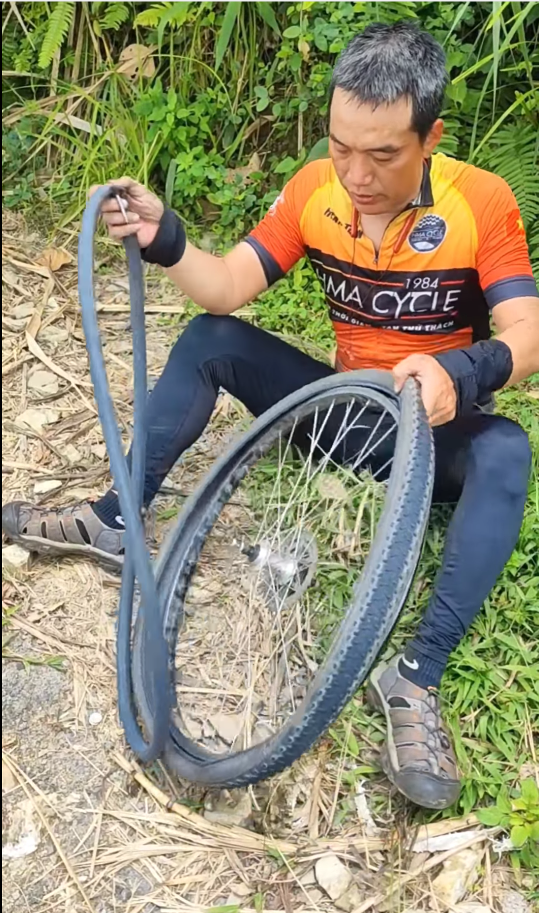 Ngoài ra, đối với những người đam mê đạp xe đi phượt thì việc hỏng xe giữa đường là điều kinh hoàng. Trong cuộc hành trình của mình, bố con anh Hoàng cũng nhiều lần phải dừng giữa đường để sửa xe.