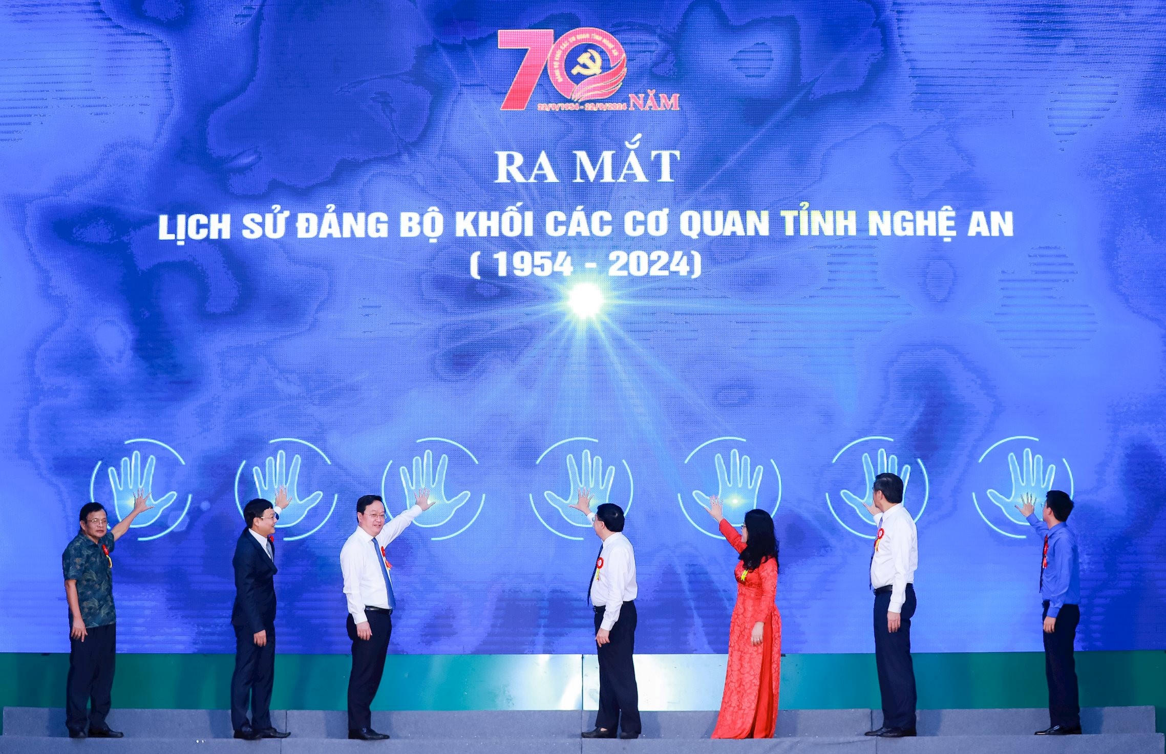 Các đại biểu thực hiện nghi thức ra mắt cuốn "Lịch sử Đảng bộ Khối Các cơ quan tỉnh Nghệ An". |