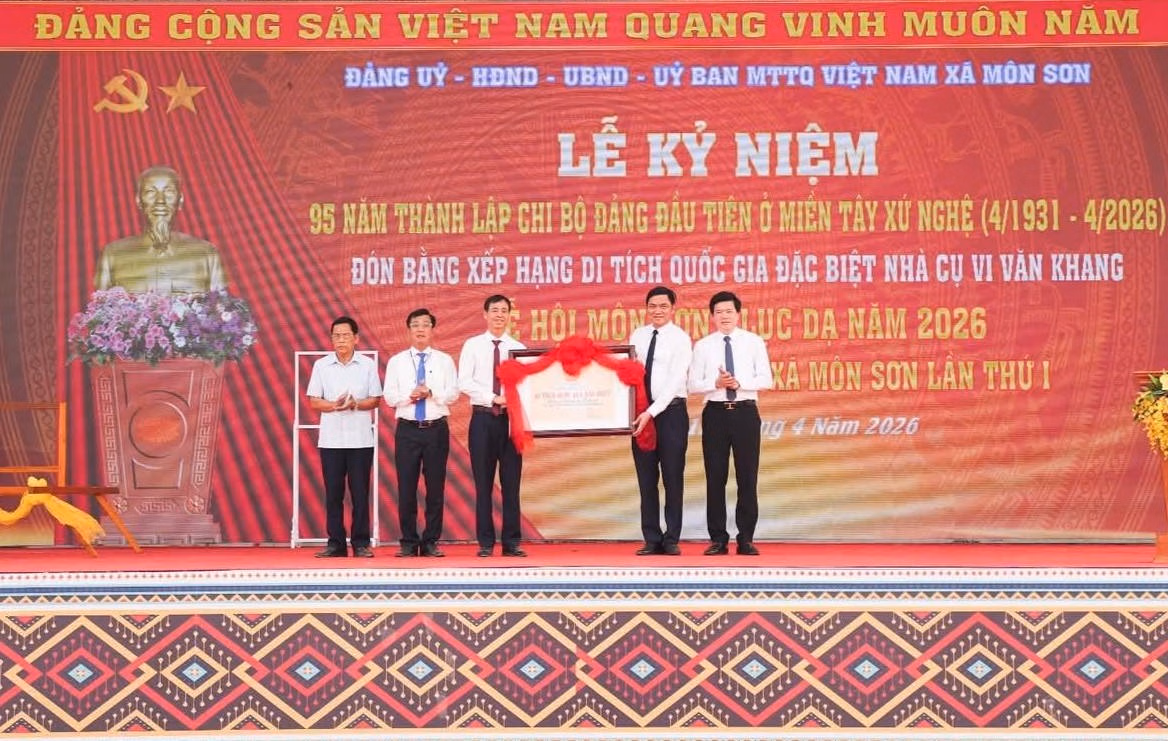 Ngày 12/4, xã Môn Sơn tổ chức Lễ kỷ niệm 95 năm thành lập Chi bộ Đảng đầu tiên ở miền Tây xứ Nghệ (4/1931 - 4/2026), đón nhận Bằng xếp hạng Di tích lịch sử quốc gia đặc biệt Nhà cụ Vi Văn Khang, khai mạc Đại hội Thể dục thể thao lần thứ I và Lễ hội Môn Sơn - Lục Dạ năm 2026.