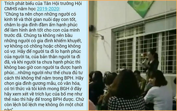 Trước đó, như báo PLVN đã đưa tin: Bà Đào Thị Hồng Phượng đã có những lời phát biểu mang nặng tính kỳ thị người nghèo, người đơn thân, người thiếu may mắn trong cuộc sống. bà nói về tiêu chuản chọn ban phụ huynh: "Gia đình khiếm khuyết, vợ không có chồng hoặc chồng không có vợ' sẽ không được làm trong ban phụ huynh học sinh.