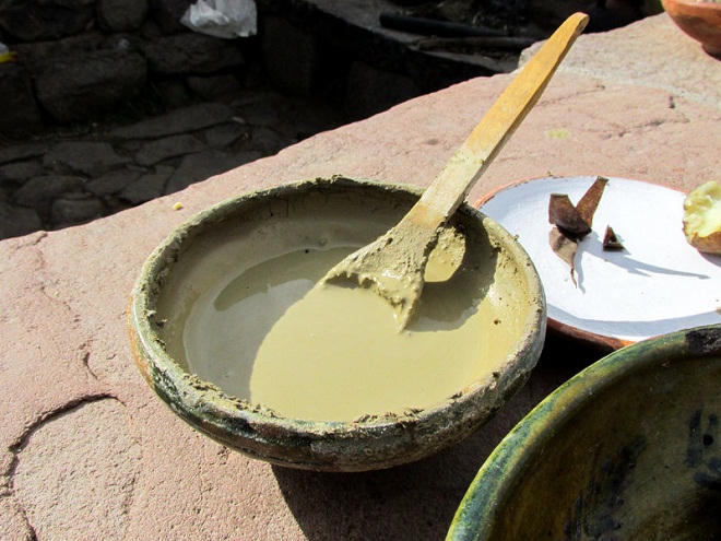 | Một tô sốt đất sét Chaco được làm tại nhà môt người dân ở vùng Puno (Peru). Họ ăn khoai tây nhúng với thứ nước sốt này trong suốt mùa thu hoạch khoai tây |