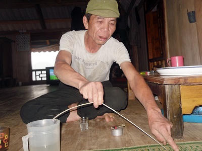 Ông Huyện nói: “Mình phải đóng máng trên thân cây, chặt 3 nhát rồi vạch đường cho nước chảy vào ống nứa. Khi nào nhựa cây “noóng” đầy ống thì mới mang về phơi gác bếp”. Theo ông Huyện, ngoài nhựa “cờ noóng” còn phải kết hợp nước cây ráy và 30 quả ớt để pha trộn. Cách bào chế là nghiền ớt tươi ra, sau đó trộn lẫn nước của cây ráy và nhựa cây “cờ noóng” vào.