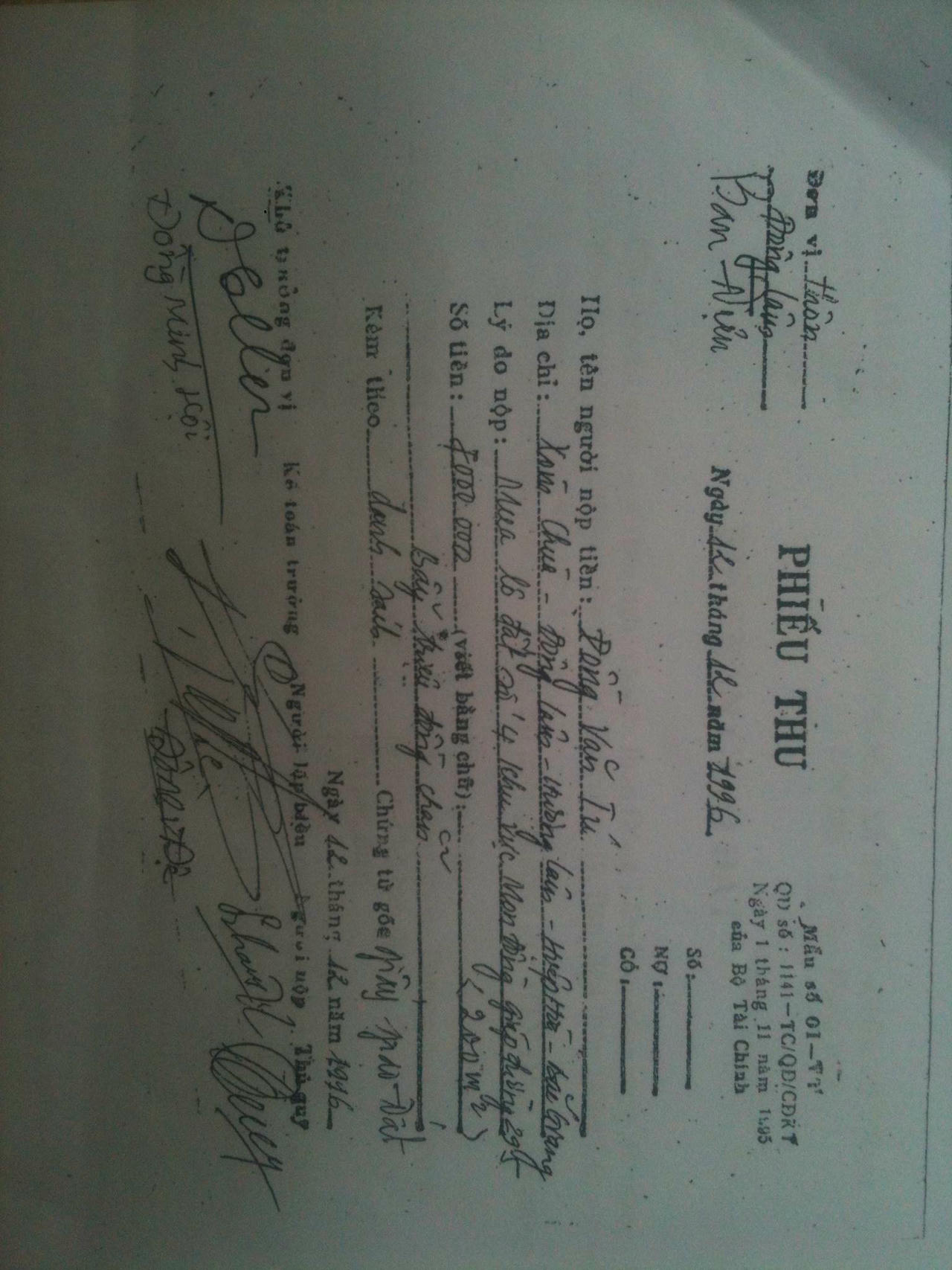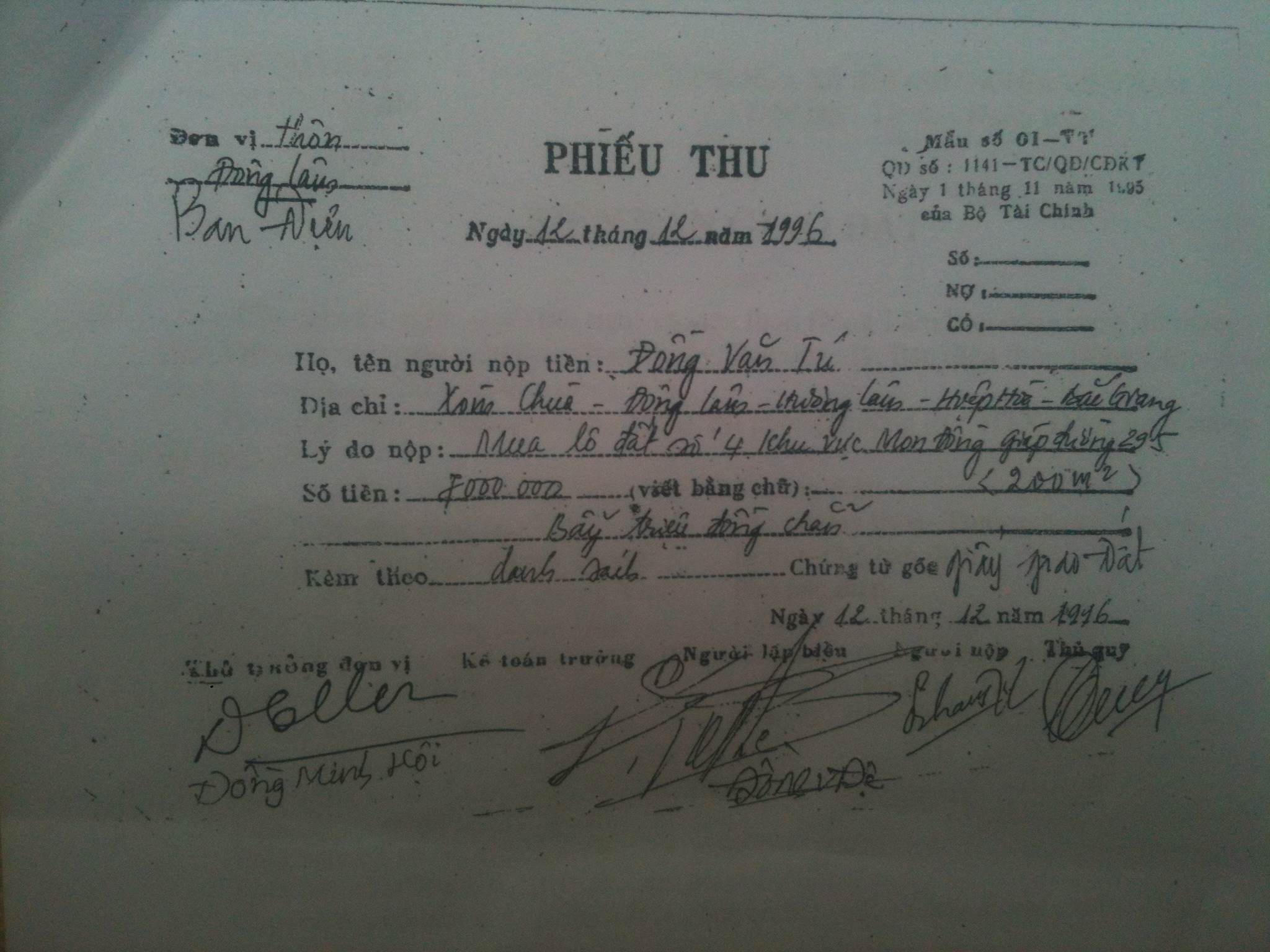 Theo ông Đồng Văn Tú, thời điểm đó ông mua 308,5m2 đất với số tiền 7,5 triệu đồng, đến nay tất cả biên bản bàn giao đất, phiếu thu tiền ông vẫn còn lưu giữ đầy đủ. “Hôm tôi đến xã lấy sổ đỏ hộ yêu cầu phải nộp thêm 138,8 triệu đồng thì mới được cấp. Hồi mới mua tôi đã nộp đủ tiền rồi, chính quyền địa phương bán cho thì chúng tôi mới vay mượn tiền để mua sao giờ lại bắt chúng tôi nộp tiền thêm lần nữa”, ông Tú bức xúc nói.