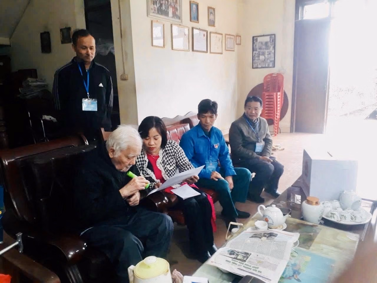 Người cao tuổi được cán bộ đến nhà hướng dẫn quy trình bỏ phiếu.