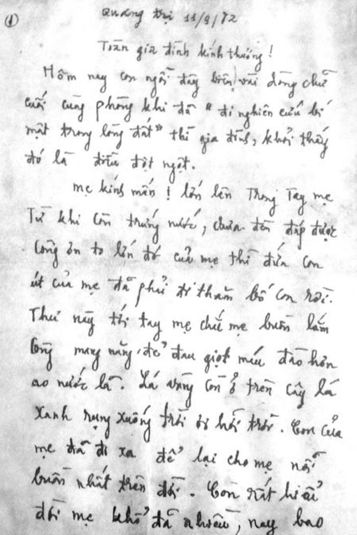 Mẹ kính mến! Thư này tới mẹ là con đã đi xa rồi. Chắc mẹ đau buồn lắm. Lớn lên trong vòng tay mẹ từ khi còn trứng nước, chưa kịp báo đáp công ơn sinh thành, giờ con đi xa là để lại cho mẹ nỗi buồn nhất trên đời.