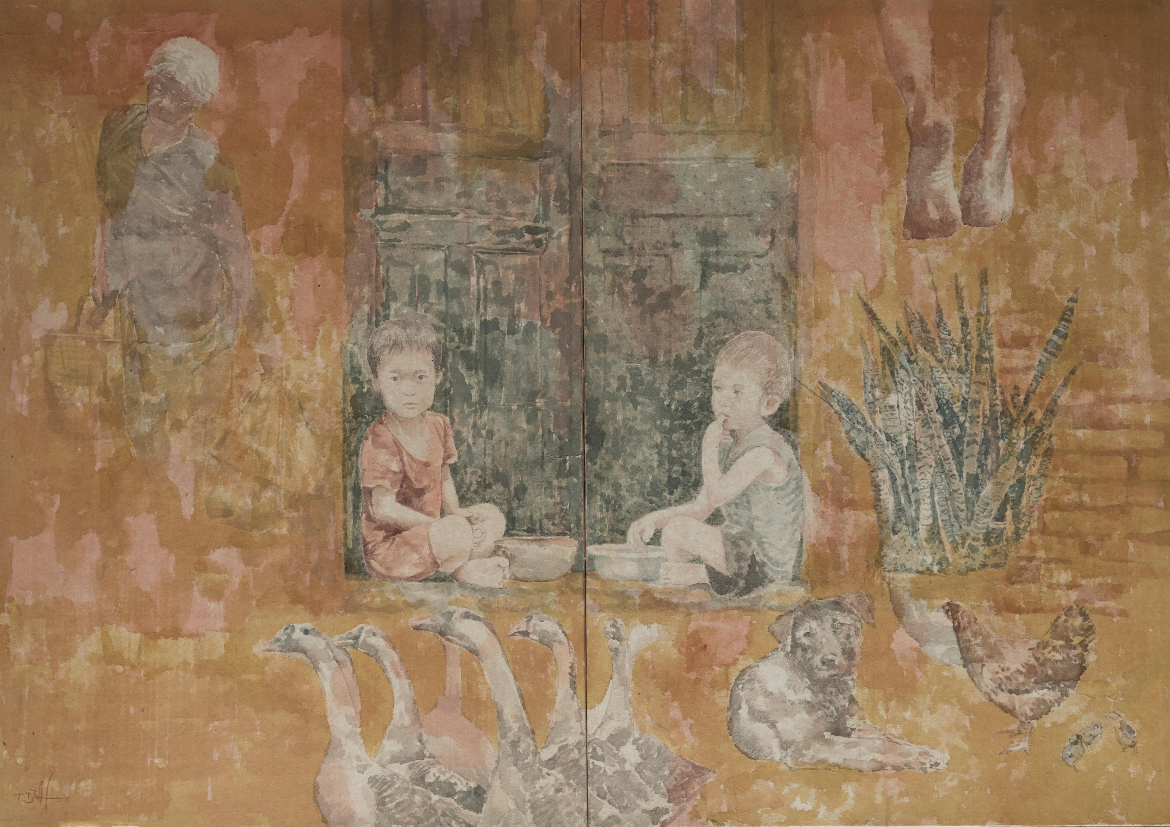 Bên cạnh sự già nua của những cụ già còn là sự ngây thơ hồn nhiên của những đứa trẻ cứ lầm lũi và mạnh bạo lớn lên. Bên cạnh cơ man núi đá trơ trọi ở Hà Giang là một chùm quả sai trĩu trịt, ánh mắt trẻ thơ trong trẻo, tươi vui. Sắc màu hoài niệm trong tranh của Thái Bình phảng phất nỗi buồn, nhưng đó là cái buồn man mác dìu dịu bởi ở đó họa sĩ luôn hé mở những hình ảnh nhen lên niềm hy vọng.
