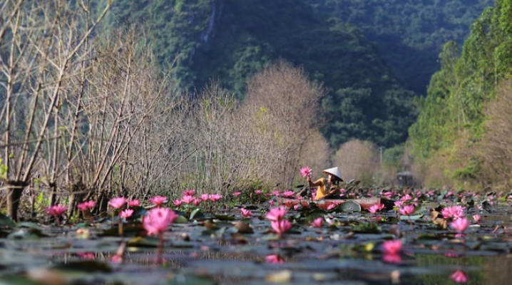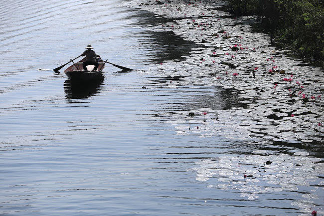 Sự xô bồ, đông đúc dịp lễ hội của chùa Hương đã không còn. Dòng suối Yến trở nên bình yên, thơ mộng hơn với không gian vắng lặng cùng những bông hoa súng nở rạng rỡ. Ảnh: Ngoc A. Hoang