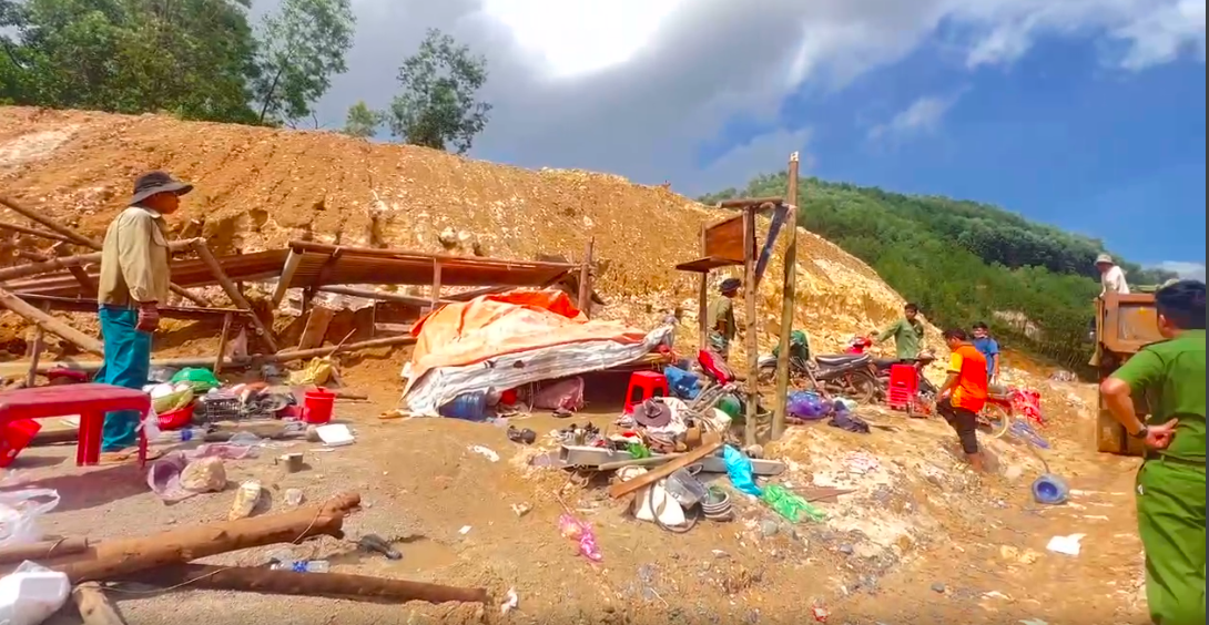 Lực lượng chức năng Lâm Đồng tháo dỡ lán trại một điểm khai thác cát trái phép. |