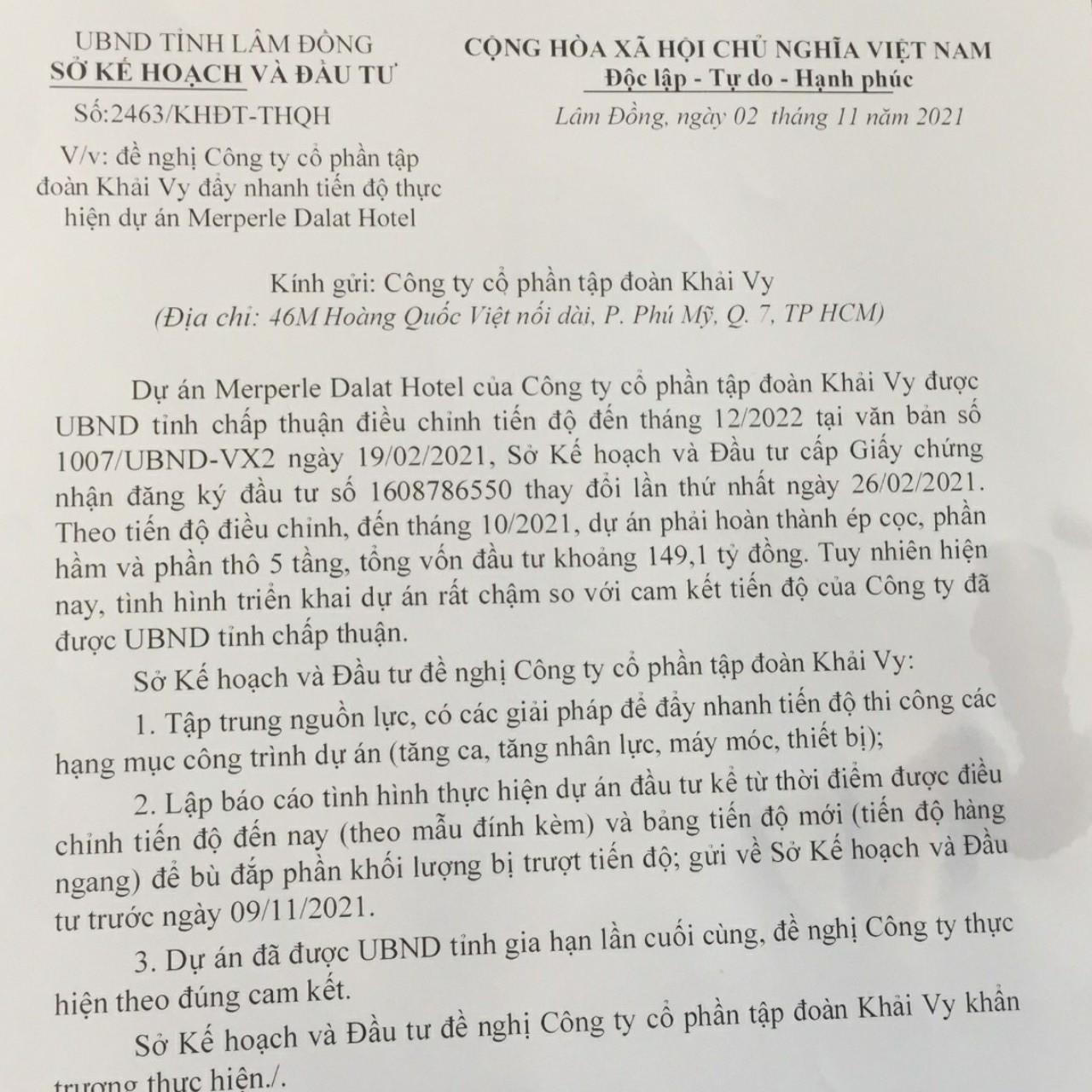 (PLVN) - Sở KH&ĐT Lâm Đồng mới đây có văn bản gửi Công ty CP Tập đoàn Khải Vy (địa chỉ phường Phú Mỹ, quận 7, TP HCM, gọi tắt là Cty Khải Vy) đốc thúc doanh nghiệp này đẩy nhanh tiến độ thực hiện dự án Merperle Dalat Hotel tại số 1 Hùng Vương, TP Đà Lạt.
