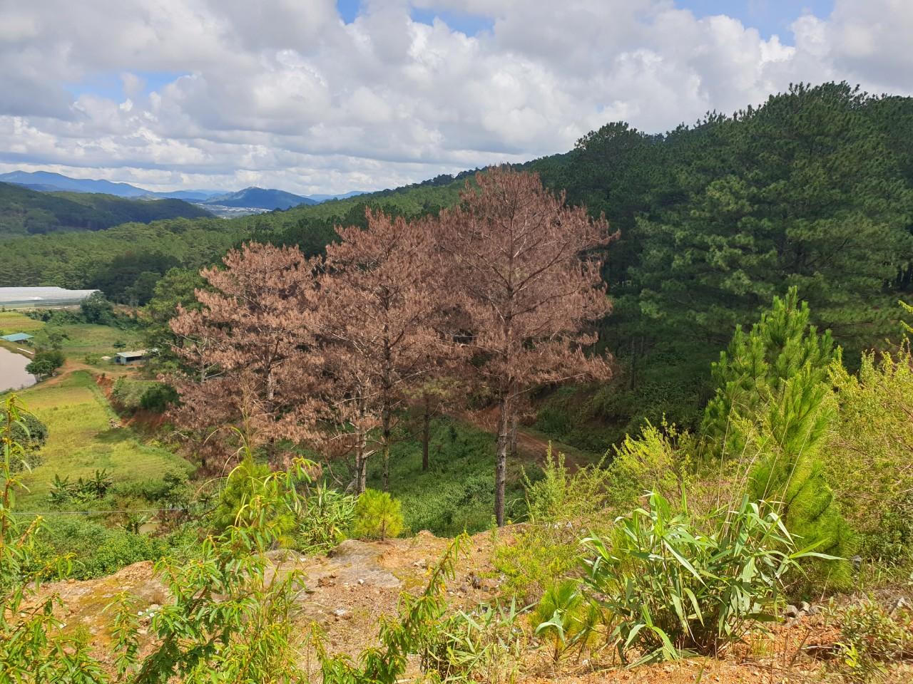 Một nhóm cây thông bị “ken cây đổ hoá chất” chết khô. |