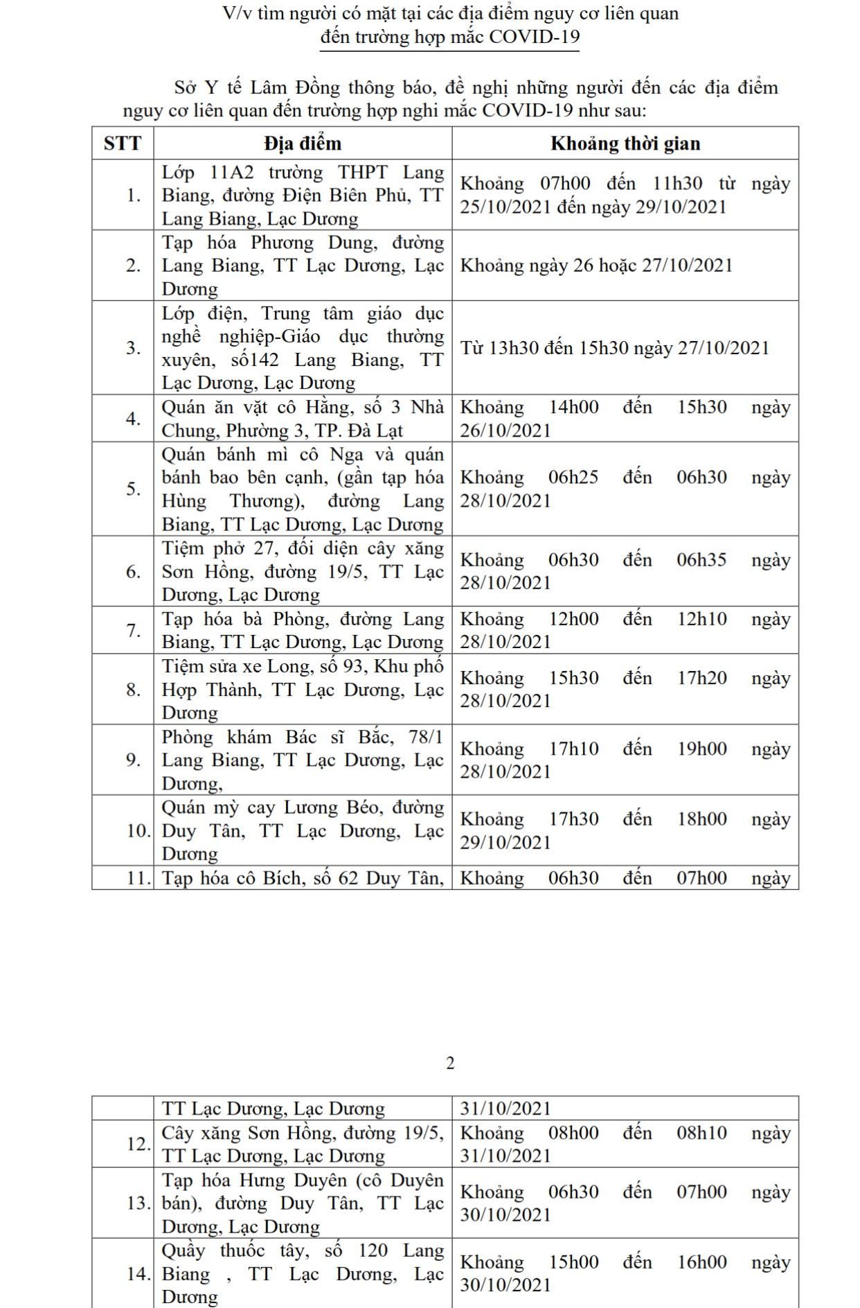21h30 phút cùng ngày, Sở Y tế Lâm Đồng phát đi thông báo tìm người có mặt tại 14 địa điểm nguy cơ liên quan đến trường hợp mắc COVID-19, trong đó có 13 địa điểm ở huyện Lạc Dương và 1 địa điểm ở TP Đà Lạt.