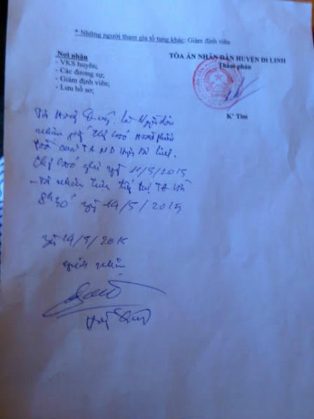 Ngày 5.3.2014 Tòa án ND huyện Di Linh đã quyết định đưa vụ án ra xét xử nhưng ngày 14.2.2014 thẩm phán Đinh Văn Sơn ký “Thông báo về việc hoãn phiên tòa” có nội dung: “Nay vì lý do: Đơn vị có công tác đột xuất, không thể mở phiên tòa đúng thời gian nêu trên”. Tiếp đó, ngày 16.6.2014 thẩm phán K’Tìm lại ký “Thông báo về việc hoãn phiên tòa” dự định mở ngày 2.7.2014 cũng với lý do: “Đơn vị có công tác đột xuất”, không sai một chữ, một dấu chấm, dấu phẩy.