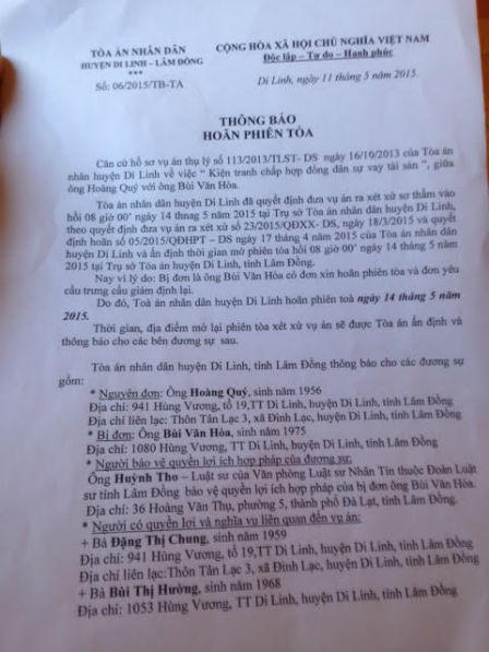 Có mặt tham dự phiên tòa này, PV Báo Pháp luật Việt Nam được ông Trần Thanh Hải – Chánh án Tòa án ND huyện Di Linh cho biết: “Tòa đã có thông báo hoãn xử”. Theo “Thông báo hoãn phiên tòa” đề ngày 11.5.2015 được văn thư giao cho ông Hoàng Quý ngay tại trụ sở Tòa thì lý do hoãn là “bị đơn Bùi Văn Hòa có đơn xin hoãn phiên tòa và yêu cầu giám định lại”.