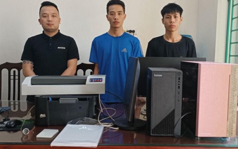 | Các đối tượng Đăng, Đình, Thanh (từ trái qua phải) và các thiết bị làm giả Căn cước. Ảnh: Công an tỉnh Hòa Bình. |