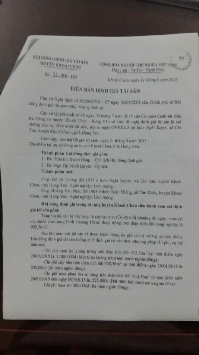 Trong biên bản định giá ghi rõ thành phần mời gồm 2 người là: ông Đỗ Bá Cường, SN 1975, ở thôn Nghi Xuyên, xã Chí Tân và ông Hoàng Văn Phúc, SN 1965 ở thôn Toàn Thắng, xã Tân Châu, cùng huyện Khoái Châu. Biên bản này còn nêu: “Hôm nay, vào hồi 8 giờ 30 phút ngày 21/9/2015. Địa điểm tại trụ sở Công an huyện Khoái Châu, tỉnh Hưng Yên...”, phía dưới có chữ ký của ông Hoàng Văn Phúc và ông Đỗ Bá Cường.