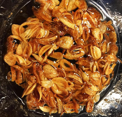 - Cuối cùng lấy hành ra, đảo đều tay cho vàng đều vì dầu lúc này rất nóng. Đổ hành vào giấy thấm dầu để ráo mỡ.