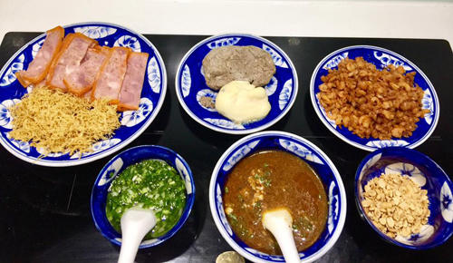 - Trụng mì qua nước sôi rồi bày ra tô. Cho tôm, thịt, trứng cút, chan nước lèo, bỏ gà vào, cho thêm bánh đa, đậu phộng, rau húng lủi, cải xanh cắt nhuyễn vào.