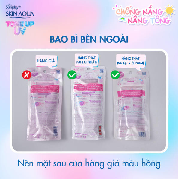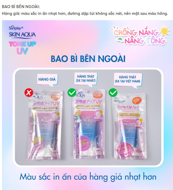 Sau đây là những dấu hiệu cụ thể có thể khiến người tiêu dùng phân biệt được sản phẩm thật/giả khi lựa chọn sản phẩm Skin Aqua Tone Up UV của công ty Rohto - Mentholatum Việt Nam: