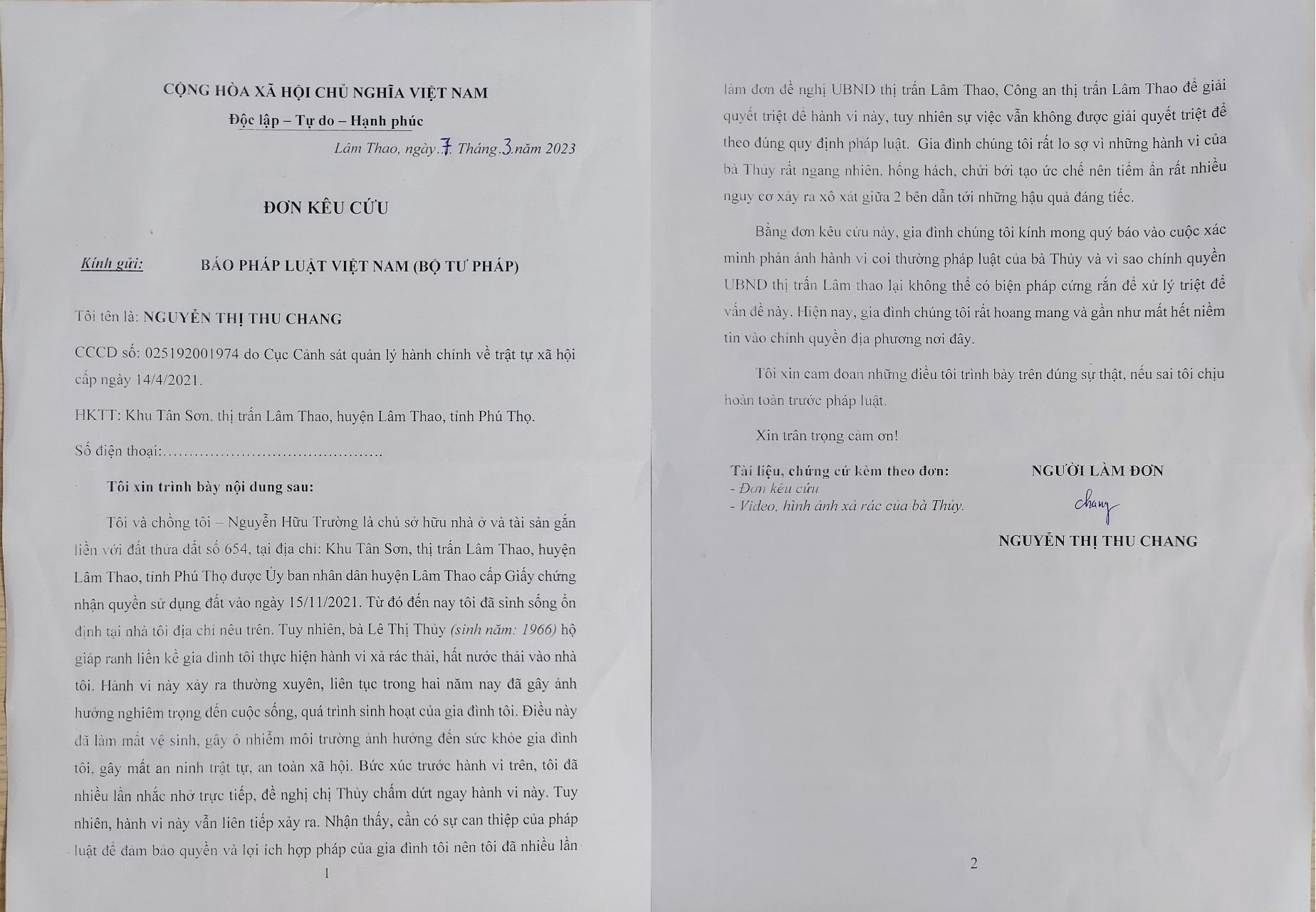 Trong đơn bà Chang trình bày: “Tôi và chồng tôi là Nguyễn Hữu Trường cùng sở hữu nhà ở và tài sản gắn liền với đất thửa đất số 654 tại địa chỉ: Khu Tân Sơn, thị trấn Lâm Thao, huyện Lâm Thao, tỉnh Phú Thọ được Ủy ban nhân dân huyện Lâm Thao cấp Giấy chứng nhận quyền sử dụng đất vào ngày 15/11/2021, từ đó đến nay tôi đã sinh sống ổn định tại đây. Tuy nhiên, bà Lê Thị Thủy (sinh năm: 1966) hộ giáp ranh liền kề gia đình tôi hàng ngày thực hiện hành vi xả rác thải, hất nước thải vào nhà tôi. Hành vi này xảy ra thường xuyên, liên tục trong hai năm nay đã gây ảnh hưởng nghiêm trọng đến cuộc sống, quá trình sinh hoạt của gia đình tôi. Điều này đã làm mất vệ sinh, gây ô nhiễm môi trường ảnh hưởng đến sức khỏe gia đình tôi, gây mất an ninh trật tự, an toàn xã hội. Bức xúc trước hành vi trên, tôi đã nhiều lần nhắc nhở trực tiếp, đề nghị chị Thủy chấm dứt ngay hành vi này. Tuy nhiên, hành vi này vẫn liên tiếp xảy ra. Nhận thấy, cần có sự can thiệp của pháp luật để đảm bảo quyền và lợi ích hợp pháp của gia đình tôi nên tôi đã nhiều lần gửi đơn đề nghị UBND thị trấn Lâm Thao, Công an thị trấn Lâm Thao giải quyết triệt để hành vi này. Tuy nhiên, sự việc vẫn không được giải quyết triệt để và hành vi vứt rác, hất nước thải vẫn diễn ra thường xuyên làm cho cuộc sống gia đình tôi bị đảo lộn, hoang mang, khó chịu tiềm ẩn nhiều nguy cơ xảy ra xô xát dẫn tới những hậu quả đáng tiếc…”.