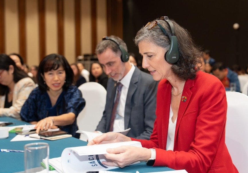 Bà Ramla Khalidi, Trưởng Đại diện thường trú của UNDP tại Việt Nam và ông Brian Allemenkinders, Tham tán phát triển, Đại sứ quán Canada tại Việt Nam đang xem Sách Trắng SIB Việt Nam 2023 |
